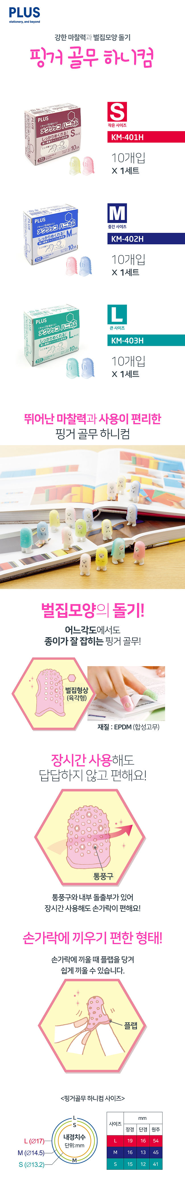 M사이즈. 10개입 어느 각도에서도 종이가 잘 집히는 손끝을 보호하는 캡형 골무 모서리가 많은 육각형(벌집형)의 돌기가 종이를 확실하게 캐치!